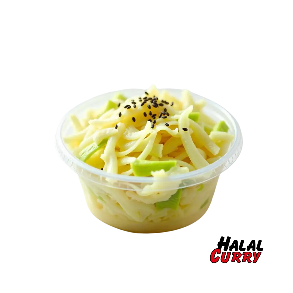 Fein geschnittener Weißkohl, mariniert in einer leichten Essig-Öl-Vinaigrette.
